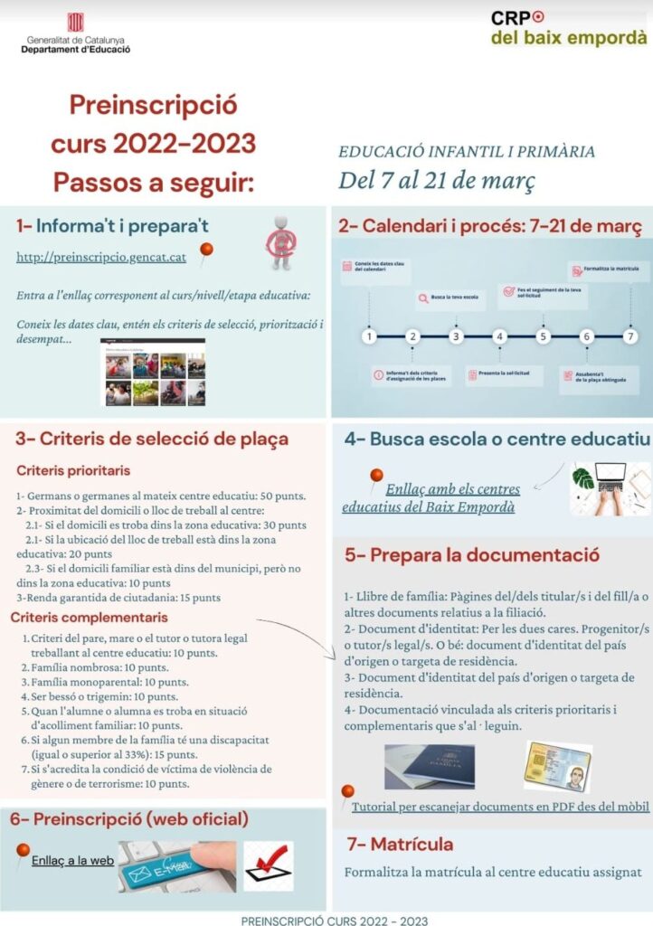 Amb l’objectiu d’oferir-vos suport amb la preinscripció del curs escolar 2022-2023, des del Centre de Recursos Pedagògics hem elaborat aquestes infografies en format pdf (contenen enllaços externs) per a infantil i primària i per a secundària en català, castellà i àrab. Us recordem que les dates de preinscripció a educació infantil i primària van del 7 al 21 de març i per a educació secundària obligatòria del 9 al 21 de març.
