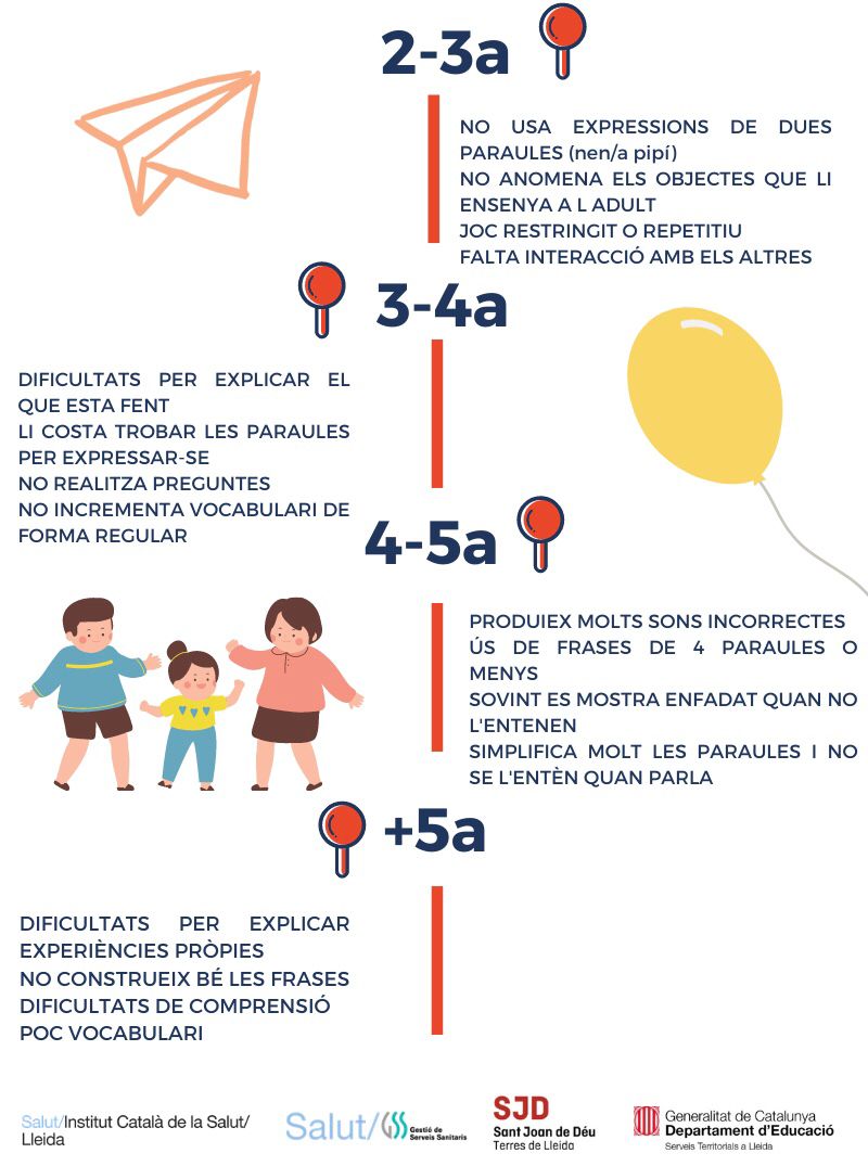 Professionals de Lleida dels departaments de Salut i Educació de la Generalitat de Catalunya han unit esforços per crear un nou protocol conjunt amb l’objectiu de detectar les dificultats en el llenguatge oral dels infants de forma precoç, per donar una resposta adequada a les seves necessitats i iniciar el procés de diagnòstic de TDLL (Trastorn de Desenvolupament del Llenguatge) quan sigui necessari. Us adjuntem dues infografies on es poden observar signes d’alerta en el llenguatge, una fins als dos primers anys i l’altra a partir dels dos anys.