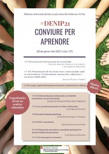 El dia 28 de gener a les 17h webinar amb el títol DENIP 21: Conviure per aprendre amb motiu del dia escolar de la No Violència i la Pau. Aquesta webinar està organitzada pel Servei d’Escola i Família per a commemorar dues dates del mes de gener: el dia 21 de gener Dia Europeu de la Mediació i el dia 30 de gener Dia Escolar de la NoViolència i la Pau (DENIP).