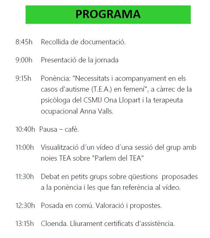 El proper divendres 7 de juny de 2024 de 9 a 14h a la sala d’actes del Centre Municipal d’Educació de Palafrugell tindrà lloc la Xa Jornada de professionals i equips d’infància i adolescència de la comarca organitzada per la Fundació Josep Pallach. Aquest any, la jornada anirà dedicada a les necessitats i acompanyament en els casos d’autisme (TEA) en femení.