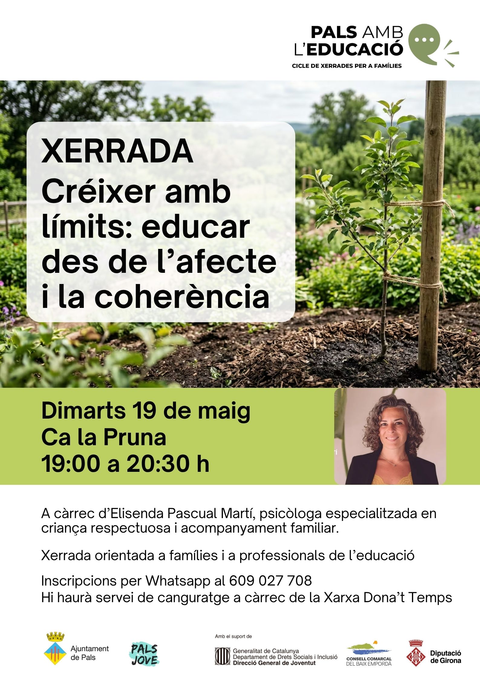 El proper dimarts 19 de maig a les 19h a Ca la Pruna de Pals tindrà lloc una nova xerrada del cicle “Pals amb l’Educació”. Porta per nom “Créixer amb límits: educar des de l’afecte i la coherència”, i anirà a càrrec d’Elisenda Pascual, psicòloga especialitzada en criança respectuosa i acompanyament familiar. Aquesta xerrada està pensada tant per a famílies com per a professionals de l’educació.