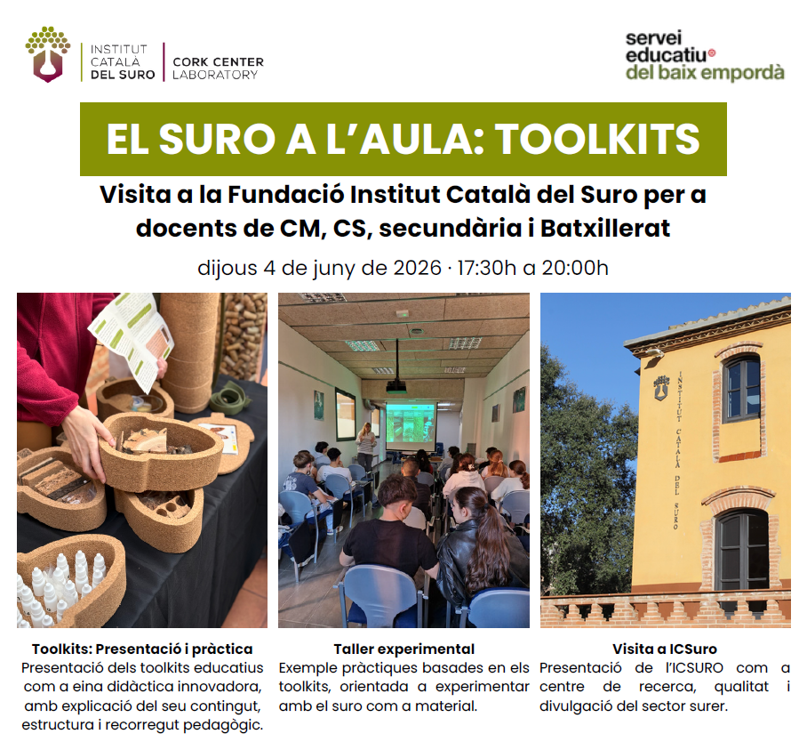 Tens ganes de portar nous materials i experiències pràctiques a la teva aula? La Fundació Institut Català del Suro (ICSuro), en col·laboració amb el Servei Educatiu del Baix Empordà, convida tots els docents de Cicle Mitjà, Cicle Superior, Secundària i Batxillerat a una visita per conèixer el potencial didàctic d’un material tan nostrat com el suro.