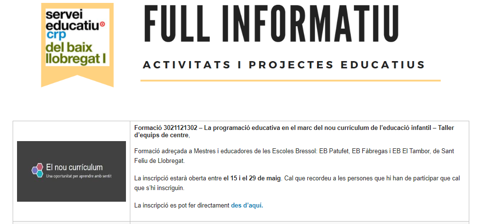 Us informem que ja s’ha obert la convocatòria unificada per al curs 2025-2026 dels programes d’innovació educativa, impulsada pel Departament d’Educació i Formació Professional.Aquesta convocatòria agrupa diverses iniciatives adreçades als centres educatius que vulguin implicar-se en processos d’innovació… Llegeix més»