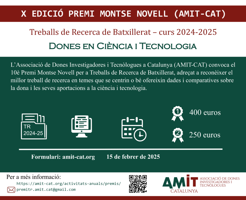 L’Associació de Dones Investigadores i Tecnòlogues a Catalunya (AMIT-CAT) convoca el X Premi AMIT-CAT per a Treballs de Recerca de Batxillerat, adreçat a reconèixer el millor treball de recerca sobre “dones, ciència i tecnologia”.