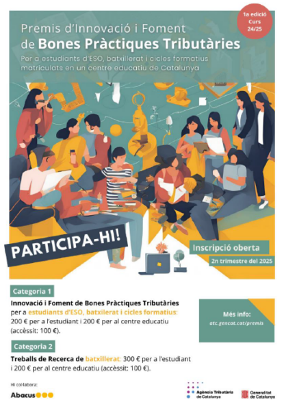 L’Agència Tributària de Catalunya convoca la 1a edició dels Premis d’Innovació i Foment de Bones Pràctiques Tributàries per a l’alumnat de secundària, batxillerat i de cicles formatius de formació professional dels centres educatius de Catalunya.