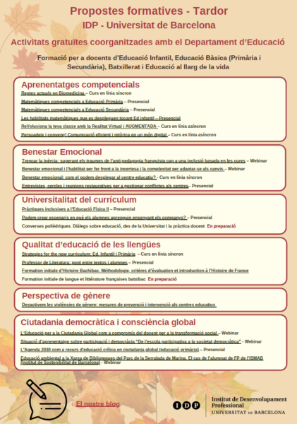 Ja estan obertes les inscripcions per les propostes formatives gratuïtes de tardor, coorganitzades amb el Departament d’Educació pel 1r trimestre del curs 2024-2025. Estan adreçades a docents d’Educació Infantil, Educació Bà sica (Primà ria i Secundà ria), Batxillerat i Educació al llarg de la vida.