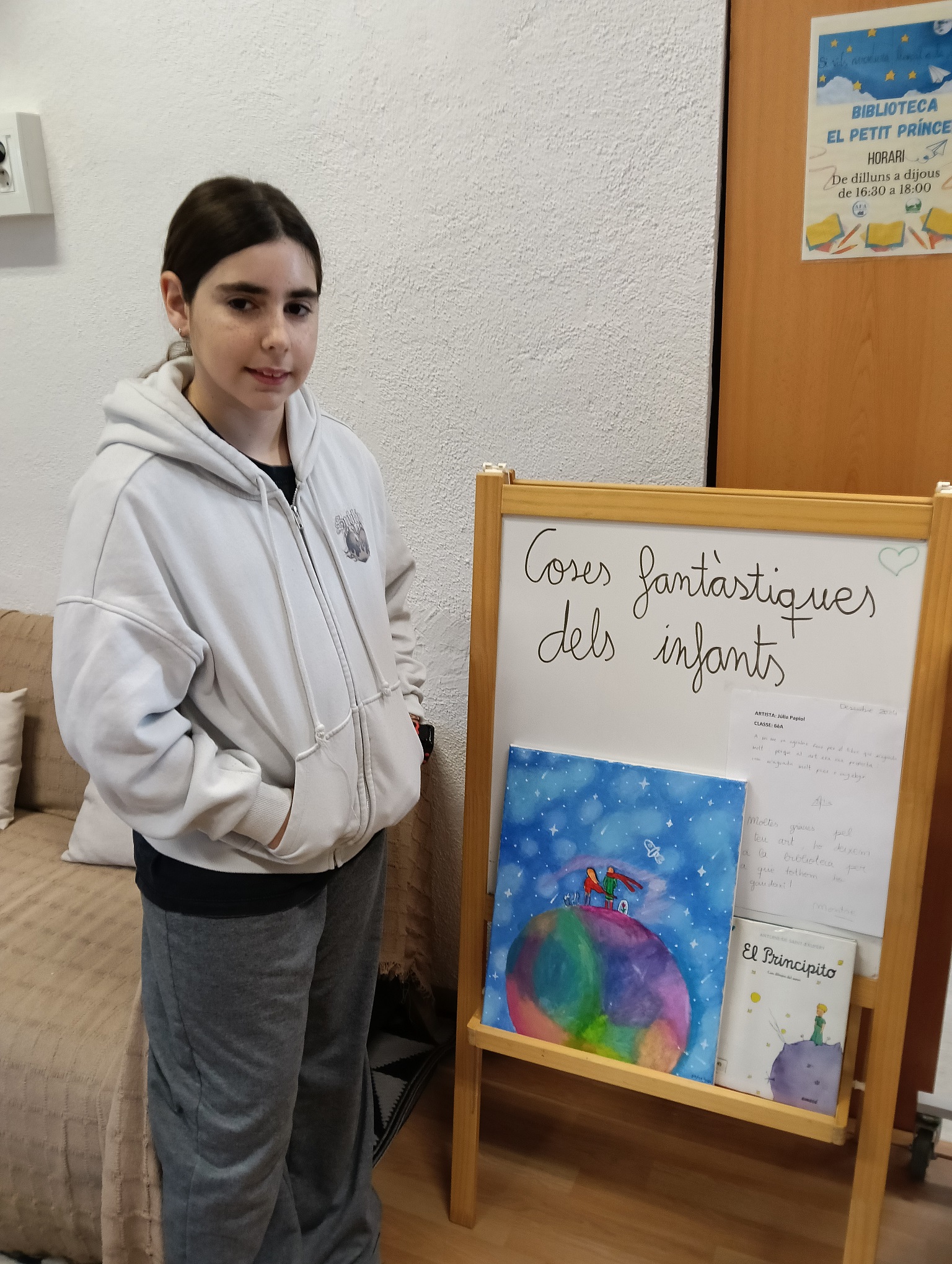 Per últim explicar un fet fantàstic què ha passat enguany. Una alumna de sisè, na Júlia Papiol, ha llegit el llibre “El principito” (llibre emmarcat en la programació d’educació en valors de sisè) i aquesta lectura l’ha motivat a fer una aquarel·la què està exposada a la biblioteca també per a què tots els usuaris el puguin gaudir. “El Principito” és un llibre que convida a pensar, i en el cas de la Júlia, crea una sinergia molt interessant amb les arts plàstiques. Una meravellosa coincidència. Al costat de la seva obra està un paper explicant el perquè fer l’aquarel·la a partir del llibre.
