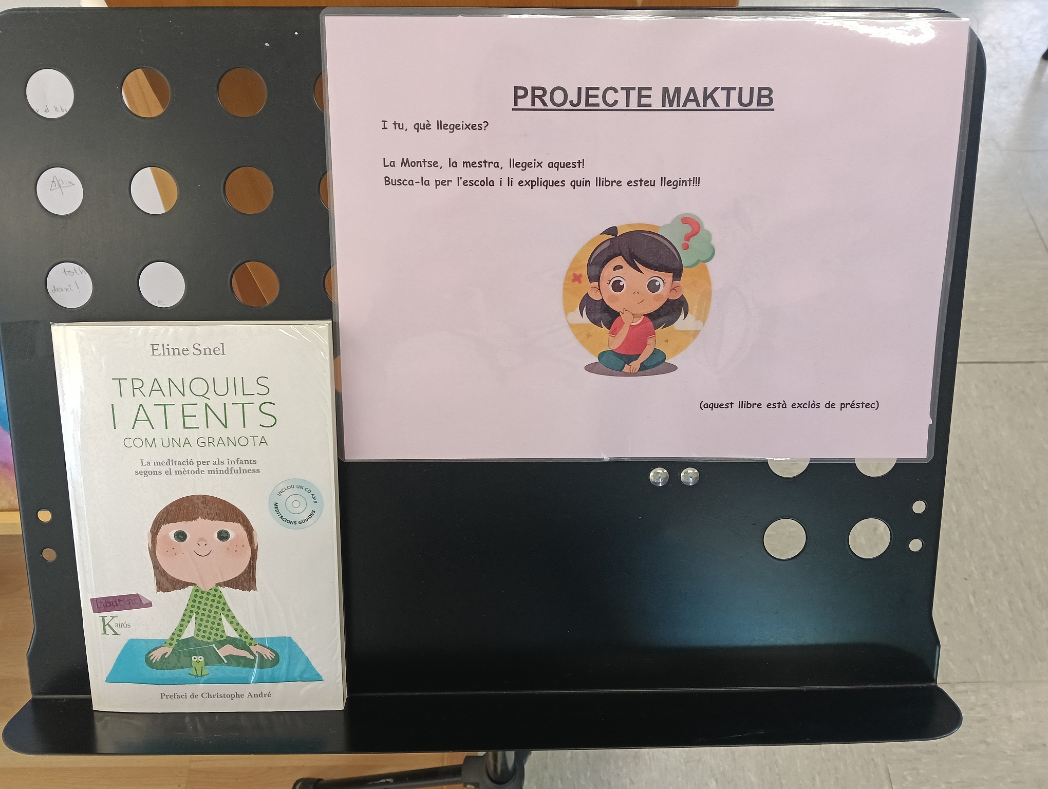 Per últim, el faristol on figura el llibre què està llegint la mestra ( una de les línies de treball del Projecte Maktub és també compartir les lectures amb els alumnes per fer de la lectura un lloc comú de gaudi i aprenentatge) és també un llibre per a créixer com a persona i com a professional de l’educació (el llibre és “Tranquils i atents com una granota” de Eline Snel).