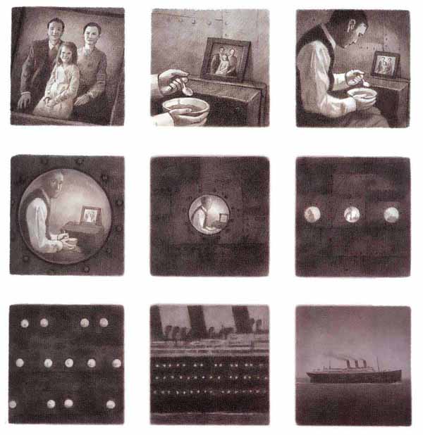 – En un altre cas, les vinyetes simulen l’ús del zoom fotogràfic, com la del protagonista menjant dins del seu camarot. En aquesta pàgina és com si l’objectiu d’una càmera fotogràfica s’anés allunya des d’un plànol gairebé subjectiu (la foto de la família) a la del vaixell enmig de l’oceà.