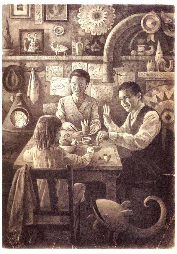 – El llibre, en sí, recorda un vell àlbum familiar de fotografies antigues de color sèpia, des de la coberta a les vinyetes interiors, passant per la reproducció de les arrugues del paper vell. Per exemple la il•lustració de la portada de l’home amb una maleta que observa un estrany animal, sembla una vella fotografia.