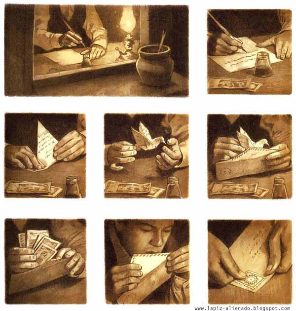 Desitjar. Al llarg del llibre es representa vàries vegades el protagonista escrivint. En escriure una carta a la família i doblegant-la  en forma d’ocell, el protagonista mostra els desitjos de retrobament.