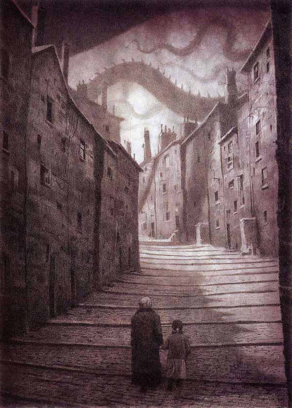 La perspectiva des del darrere dels personatges en un carrer solitari dominat per les cues de rèptil dóna la sensació de vulnerabilitat. Amb aquesta perspectiva l’il·lustrador vol que el lector vegi el que veu el protagonista i senti el que sent.