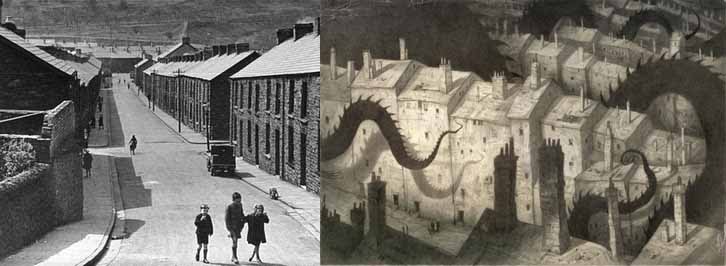 – Les il•lustracions del poble d’on és originari el protagonista recorden els pobles de les conques carboníferes de Gal•les o dels enclavaments rurals de l’interior d’Irlanda de finals del segle XIX i començaments del segle XX.