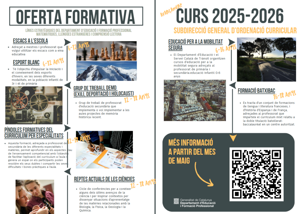 Avançament oferta formativa – CurrículumPer Redacció / 22/04/2025 / Currículum Formació Portada Us presentem les infografies amb la proposta formativa relacionada amb el currículum organitzada per la Subdirecció general d’Ordenació Curricular