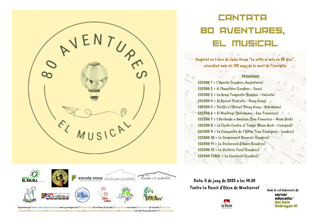 La representació es farà el dijous 5 de juny de 2025 a les 14:30 al Teatre de la Passió d’Olesa de Montserrat i comptarà amb la participació directa d’uns 300 alumnes de 4t d’educació primària que cantaran i ballaran al ritme dels instruments dels docents del Grup de Mestres de Música.