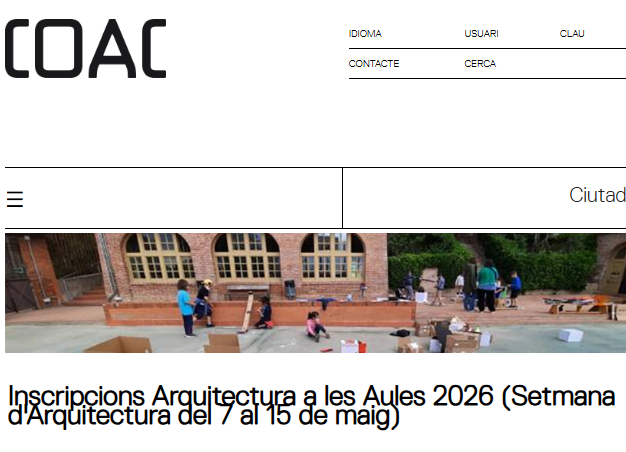 El COAC (Centre obert d’Arquitectura) ha obert una nova convocatòria d’Arquitectura a les Aules, el programa de tallers d’arquitectura als centres educatius que organitzen cada mes de maig, en el marc de les Setmanes d’Arquitectura i que en aquesta edició formaran part de la programació per la Capitalitat Mundial de l’Arquitectura, Barcelona 2026 i comptarà amb especial suport de l’Ajuntament de Barcelona.