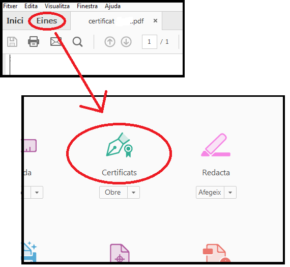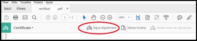 - A la part superior del document apareixerà la barra Certificats, dins la qual hem de polsar a Signar digitalment