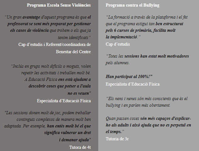 Programa Contra el Bullying 5a edició. Metodologia de prevenció de l’assetjament escolar testada en 26 escoles de primària i 5.000 infants durant dos anys, i que redueix en un 35,8% les víctimes de bullying i en un 61% les de ciberbullying. Aquest programa inclou: