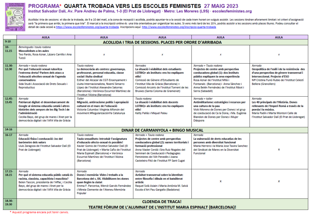 El proper dissabte 27 de maig de 2023 es celebra la Quarta trobada vers les escoles feministes i encara estan obertes les inscripcions. Us passem el detall del programa: