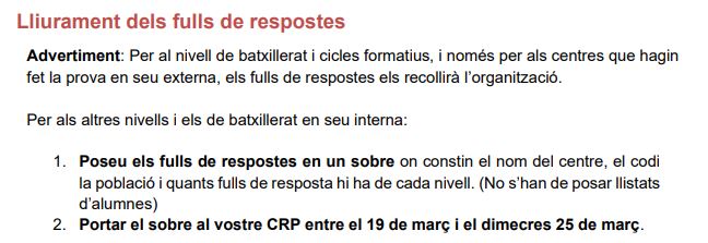L’horari del CRP per a recollir els sobres amb els fulls de respostes del 19 al 25 de març serà de matins de 8 h a 14 h i tardes de 15 h a 17.00 h (excepte divendres).