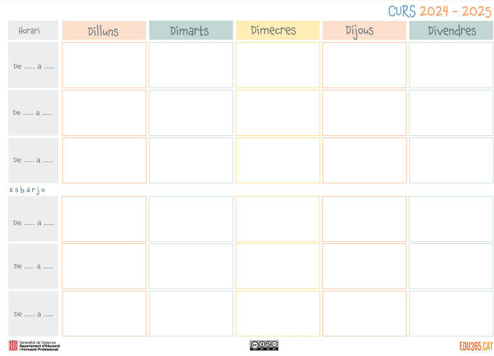Tot un seguit de recursos per ajudar a planificar i organitzar millor el dia a dia a l’aula d’alumnat i professorat. Trobareu calendaris de curs i d’aula, planificador mensual, planificador setmanal, horari setmanal per a primària i per a secundària…
