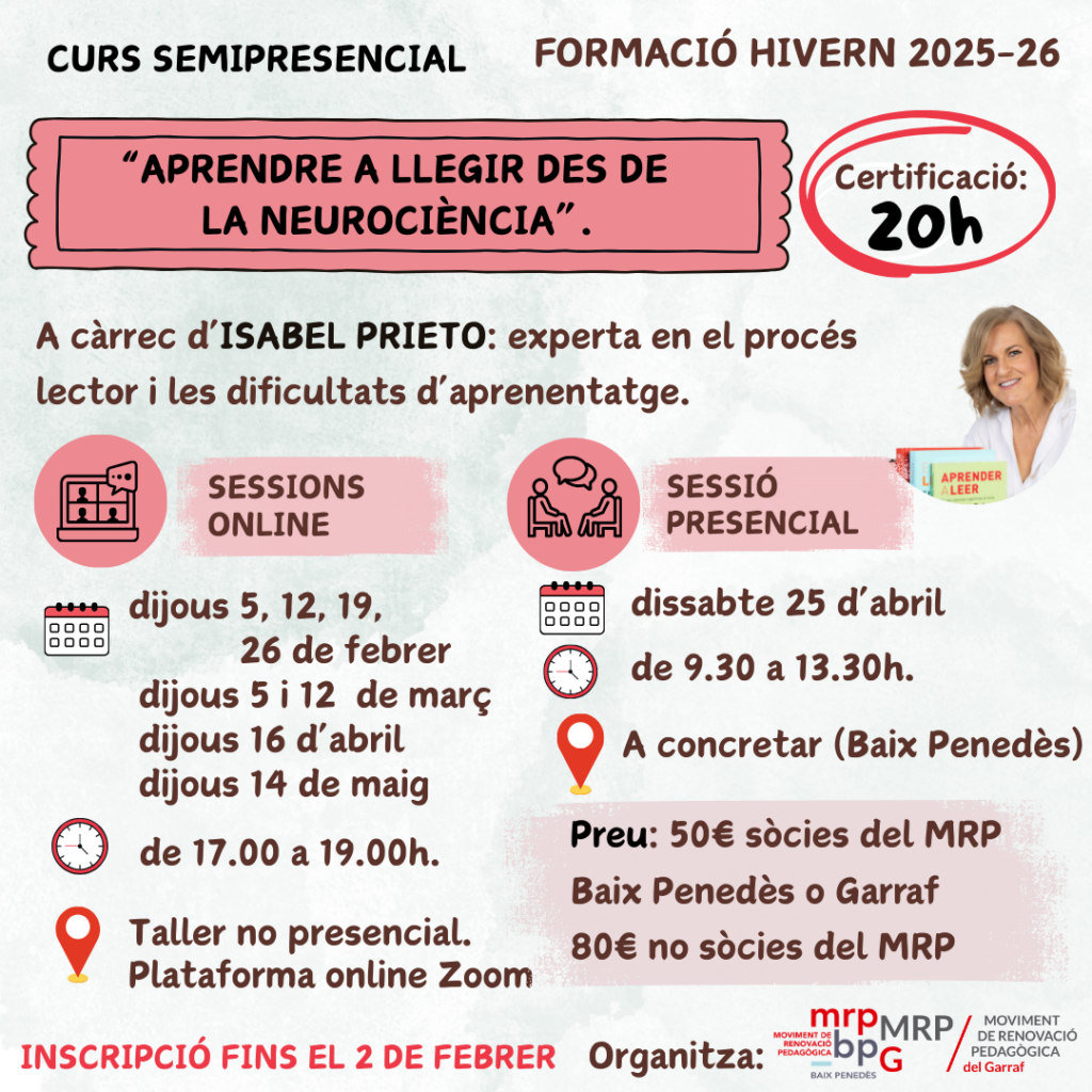 APRENDRE A LLEGIR DES DE LA NEUROCIÈNCIA a càrrec de la Isabel Prieto, especialista en el procés lector i dificultats d’aprenentatge i docent del Postgrau de Neuroeducació a la Universitat de Barcelona.