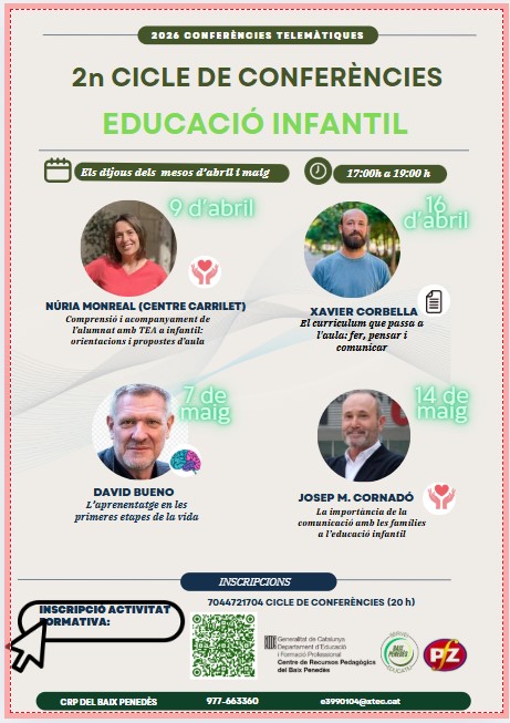 (16/04/2026) Xavier Corbella:El curriculum que passa a l’aula: fer, pensar i comunicar. (07/05/2026) David Bueno: L’aprenentatge en les primeres etapes de la vida. (14/05/2026) Josep Maria Cornadó: Com treballar amb les famílies a l’educació infantil? |