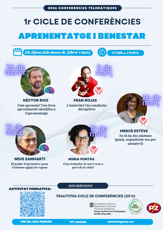 05/03/2926) Fran Rojas: L’autoritat i les conductes disruptives. (12/03/2026) Neus Sanmartí: El poder d’aprendre: quan l’alumne agafa les regnes. (19/03/2026) Núria Fontàs: Com treballar la mort a partir de la vida? (26/03/2026) Mercè Esteve: No hi ha dos alumnes iguals, organitzem-nos per atendre’ls. |