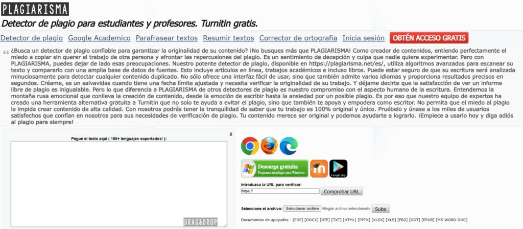Una web amb un ús senzill per ajudar a l’usuari a comprovar si ho ha hagut plagi. Límit màxim 1000 paraules, també funciona pegant o pujant arxiu per comprovar.