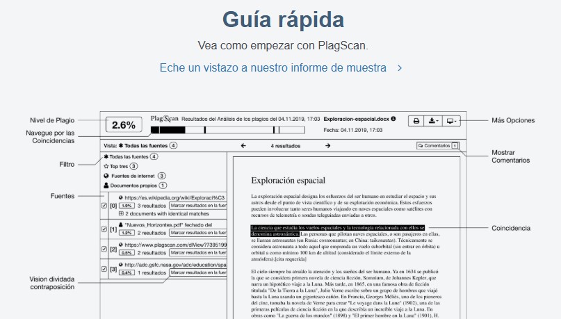 Un altre dels detectors de plagis recomanats és PlagScan, en aquest cas, destaca per incloure la possibilitat de pujar un document en format Word o .txt. La web detecta el percentatge d’autenticitat del text carregat. Per poder comptar amb totes les funcionalitats, és necessari registrar-se.