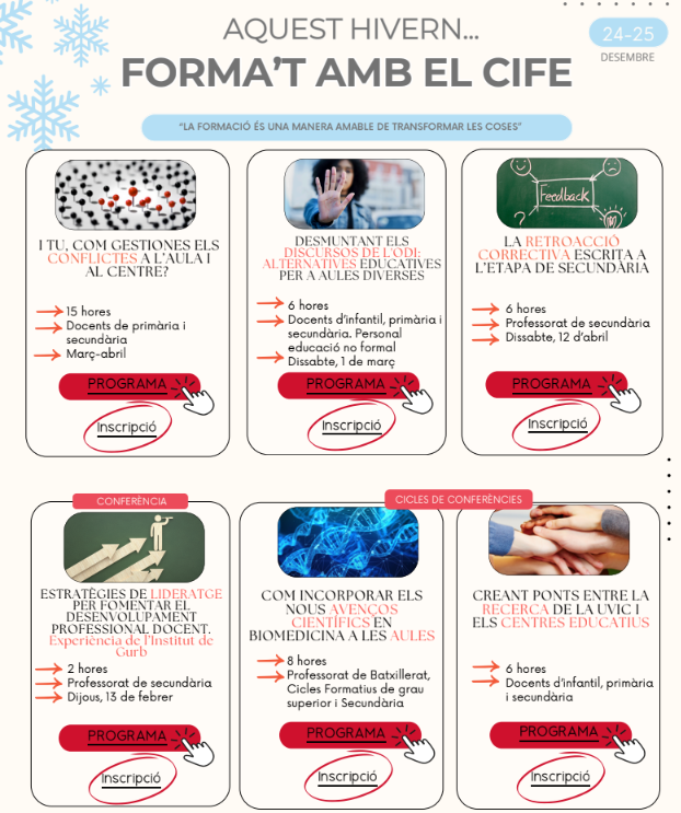 Des del CIFE (Centre d’Innovació i Formació en Educació (UVIC/UVIC-UCC) ens fan arribar les propostes formatives en línia o en dissabte, reconegudes pel Departament d’Educació i Formació Professional, per aquest període. Cliqueu FORMA’T HIVERN (6) per accedir-hi a la descripció de l’activitat i inscripció.