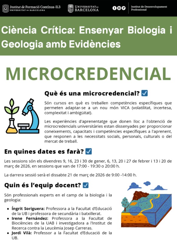 Des de l’Institut de Desenvolupament Professional (IDP) de la Universitat de Barcelona hem preparat quatre microcredencials adreçades a docents i altres professionals, amb l’objectiu d’oferir formació flexible i reconeguda en competències clau.