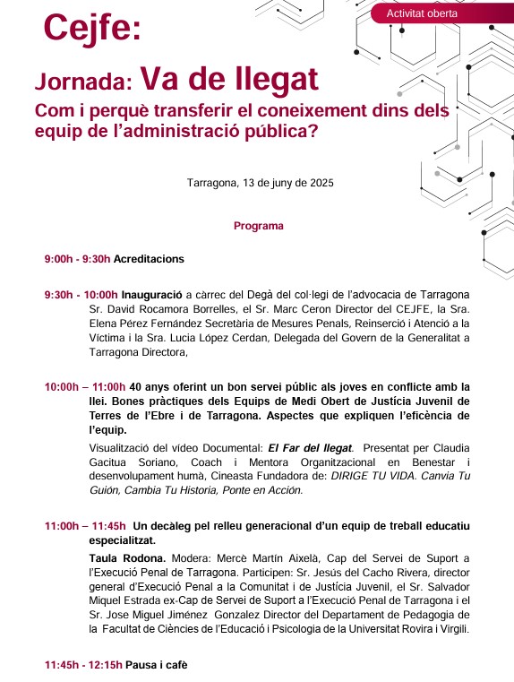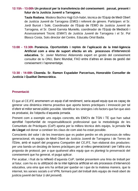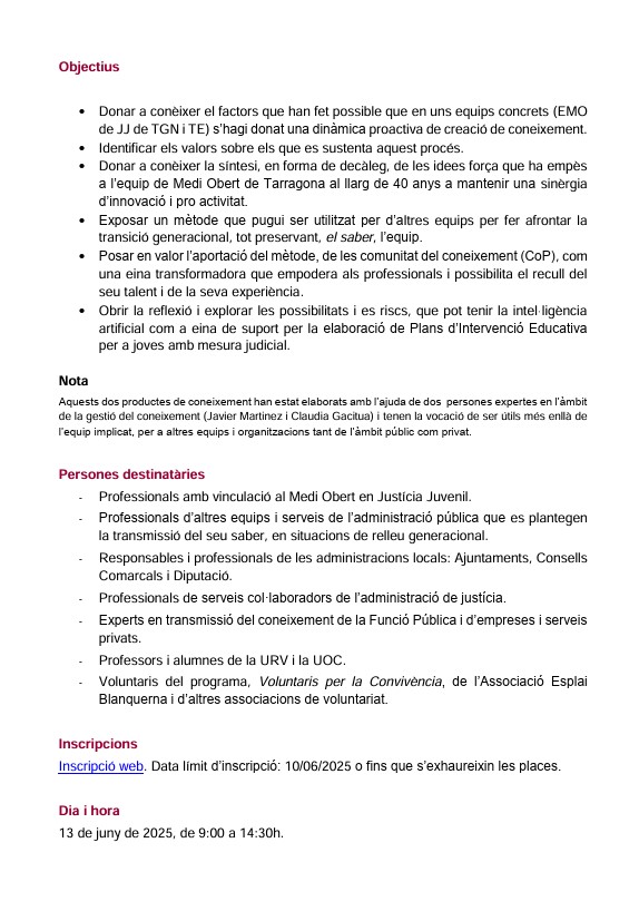 Se’ns ofereix com una oportunitat única per reflexionar i compartir experiències sobre la importància de preservar i transmetre el coneixement dins dels nostres equips. Amb la participació de professionals destacats i la presentació de bones pràctiques dels Equips de Medi Obert de Justícia Juvenil de Tarragona i Terres de l’Ebre, s’exploraran eines i metodologies que faciliten aquesta transferència de coneixement, essencial per garantir la continuïtat i l’eficiència dels serveis públics.