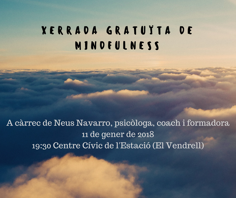 Xerrada gratuïta “Mindfulness”Per CRP del Baix Penedès / 8 de gener de 2018 / Portada Xerrades Al Centre Cívic l’Estació (El Vendrell), l’11 de gener a les 19:30h, la psicòloga, coach i formadora Neus Navarro oferirà una xerrada gratuïta sobre el “Mindfulness“.