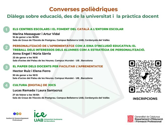 La primera proposta, creada per l’Institut Desenvolupament Professional (IDP) conjuntament amb l’ICE de la Universitat Autònoma de Barcelona, són unes Converses Polièdriques. Diàlegs sobre educació, des de la universitat i la pràctica docent.