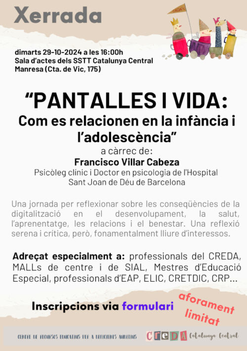 Dimarts, 29 d’octubre de 2024, a les 4 de la tarda, a la sala d’actes dels Serveis Territorials a la Catalunya Central, Manresa, tindrà lloc la xerrada “Pantalles i Vida, com es relacionen a la infància i l’adolescència”. La conferència anirà a càrrec del Dr. Francisco Villar Cabeza, psicòleg clínic i Doctor en psicologia.