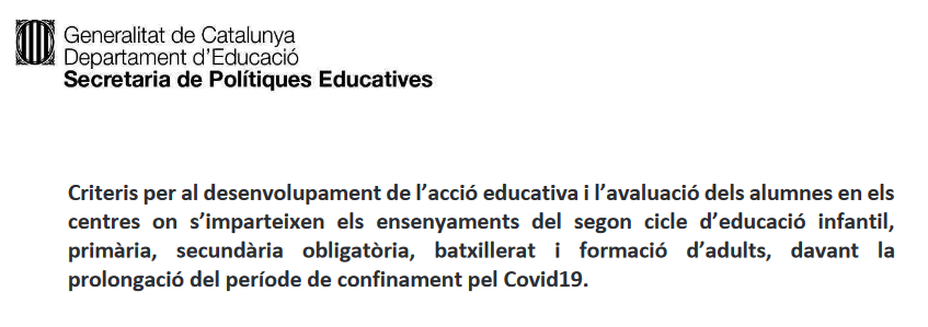 Podeu llegir aquí íntegrament els criteris sobre l’avaluació i el seguiment de l’alumnat durant el període de confinament a causa del Covid-19.