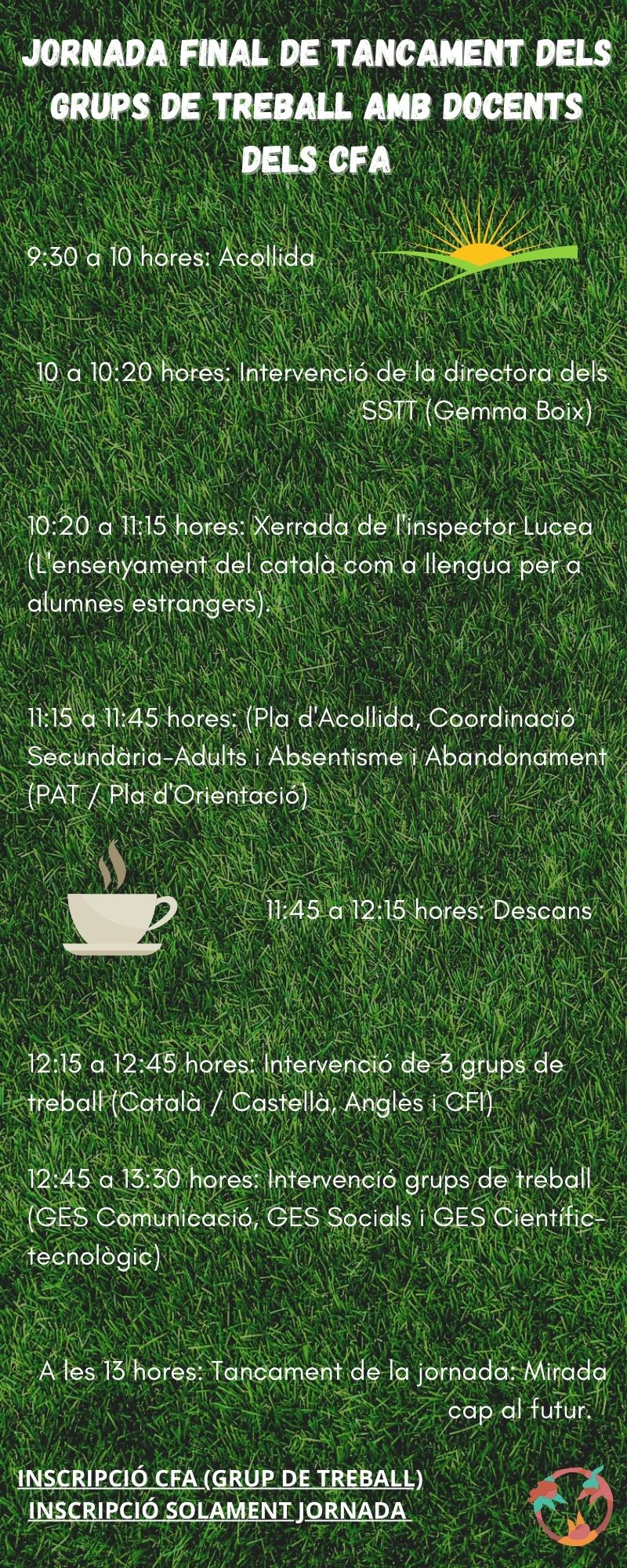 El proper dijous 30 de juny hi haurà la trobada final com a acte que culmina la tasca feta en els grups de treball que els docents dels diversos ensenyaments dels CFA han portat a terme. La trobada serà a l’edifici de Can Gallifa a Sant Joan de Vilatorrada(al centre cívic Can Gallifa). La direcció és Passeig Gallifa, 1. Serem a la sala d’actes situada a peu de carrer. A les 9:30 anirem fent la recepció dels participants i a les 10h iniciarà la jornada, acabant a les 13h.
