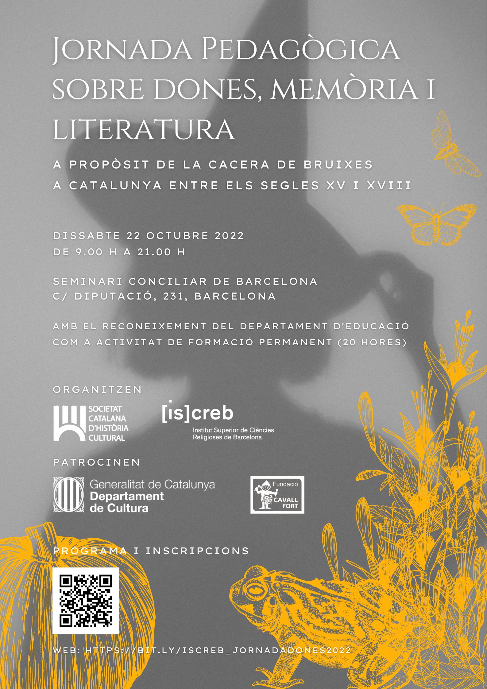 Jornada Pedagògica sobre dones, memòria i literatura (a propòsit de la cacera de bruixes a Catalunya entre els segles XV i XVIII). Es tracta d’una iniciativa que resulta de la coŀlaboració entre la Societat Catalana d’Història Cultural i l’Institut Superior de Ciències Religioses de Barcelona, que gaudeix de la presència destacada de la Universitat de Barcelona i que té lloc al Seminari Conciliar de Barcelona durant el dia 22 d’octubre de 2022, de 9.00 h a 21.00 h