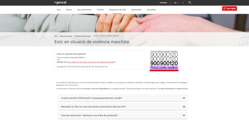 Us fem arribar l’enllaç a l’apartat Situacions de Vida de la Web Generalitat on s’ha incorporat l’apartat “Estic en situació de violència masclista“, on trobareu informació pràctica, molt clara i ben organitzada de què pot fer i a on es pot adreçar una dona que es troba en una situació de violència masclista.
