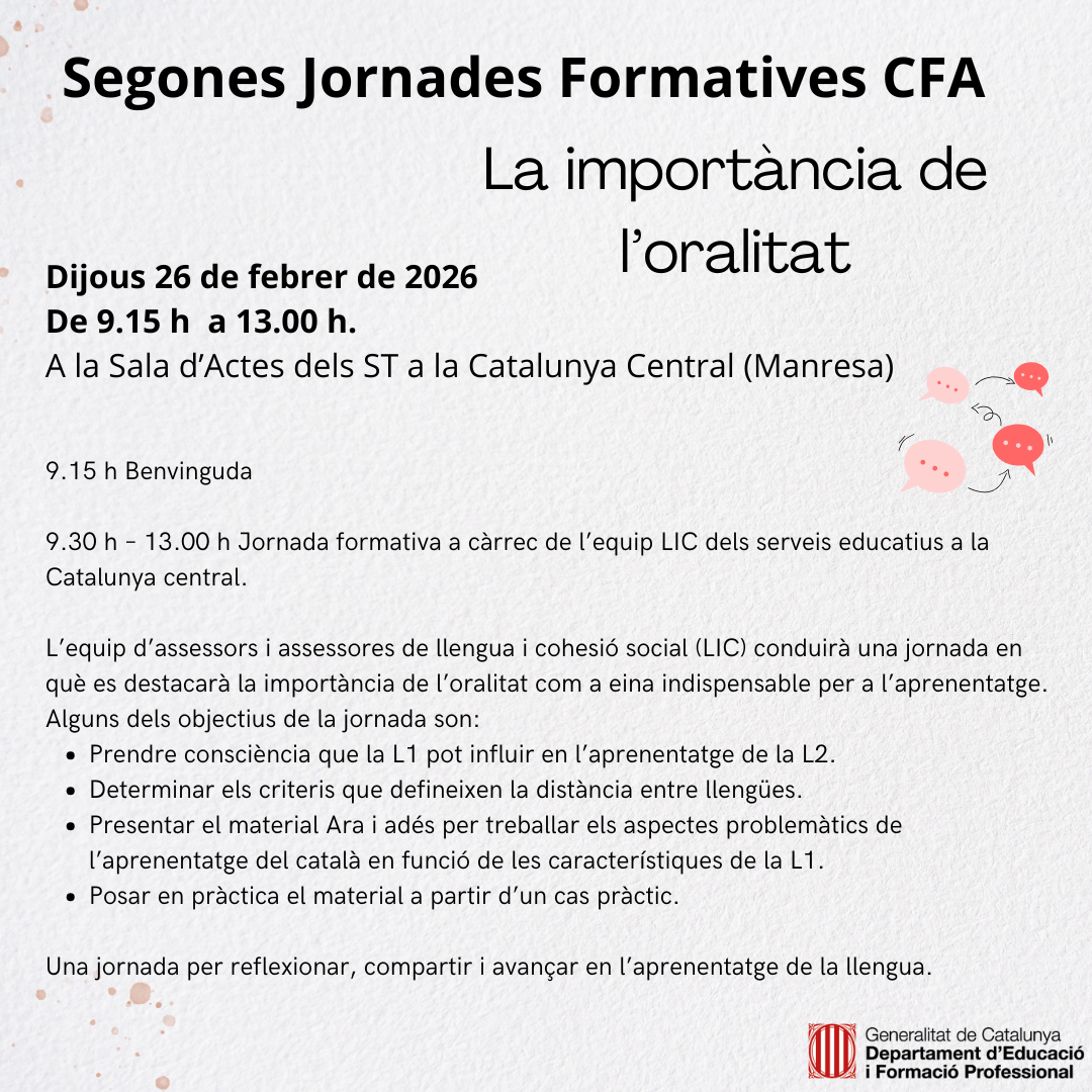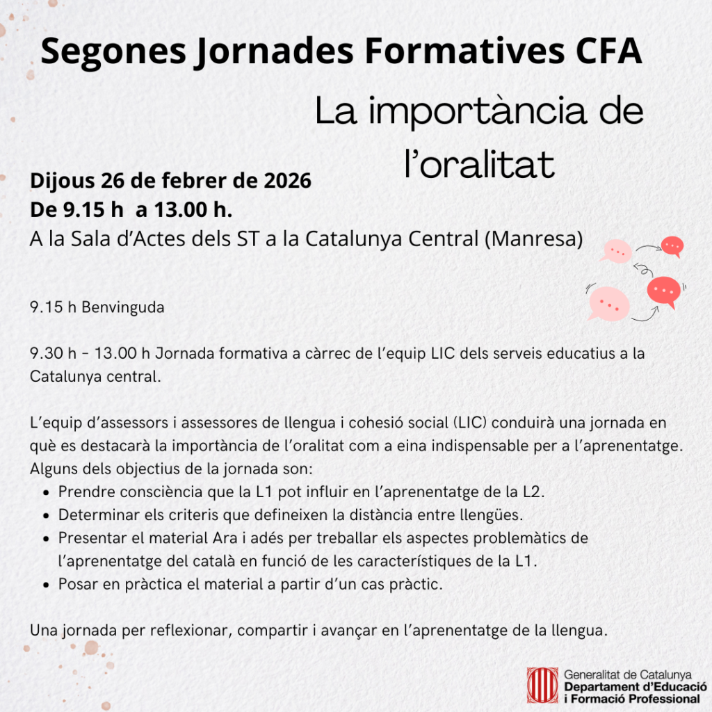 El 26 de febrer es realitzarà la II Jornada formativa de centres d’adults, a càrrec de l’equip LIC dels serveis educatius de la Catalunya Central. L’equip d’assessors i assessores de llengua i cohesió social (LIC) conduirà una jornada en què es posarà en relleu la importància de l’oralitat com a eina indispensable per a l’aprenentatge.