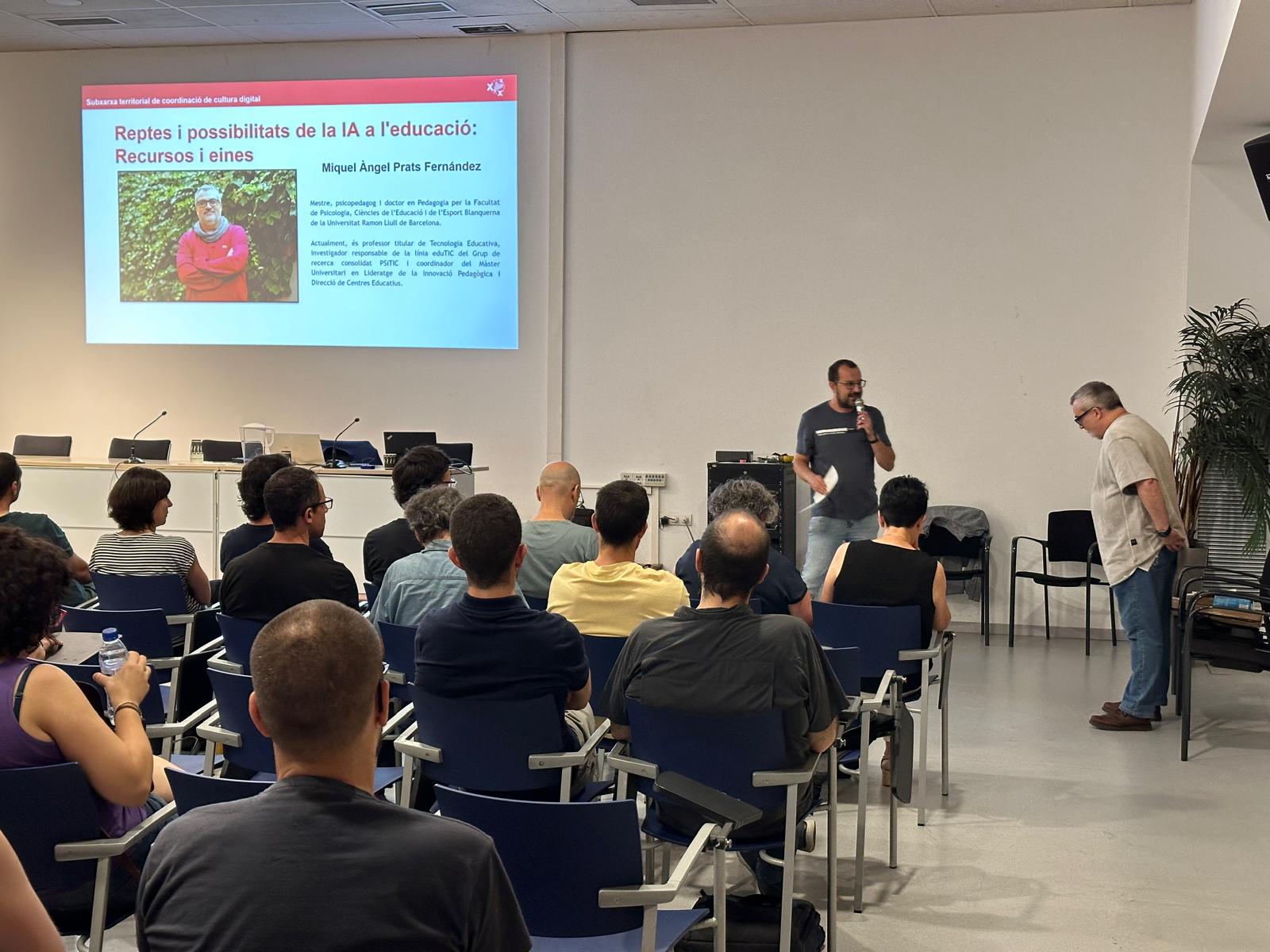 La jornada va començar amb la conferència de Miquel Àngel Prats Fernández, mestre, psicopedagog i doctor en Pedagogia per la Facultat de Psicologia, Ciències de l’Educació i de l’Esport Blanquerna de la Universitat Ramon Llull de Barcelona, que va parlar sobre els reptes i possibilitats de la IA a l’educació. Després d’un breu descans va arribar el torn dels docents dels centres, que van explicar bones pràctiques educatives de cadascuna de les competències digitals específiques.