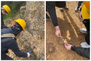 En primer lloc, s’han situat geogràficament amb el GPS, han copsat el relleu de la zona i han diferenciat els materials superiors dels inferiors que es veien a simple vista. Tot i el plugim de primera hora, han treballat de valent per analitzar la consistència, la resistència, la impermeabilitat, la ductilitat i la presència de carbonats en ambdós materials. Dividits en 4 equips de treball i amb els instruments que els hem proporcionat (martell de geòleg, àcid clorhídric, aigua i clau dicotòmica) han identificat els materials superiors com a calcàries fossilíferes (amb coralls i conquilles) i els inferiors com a lutites (argiles).