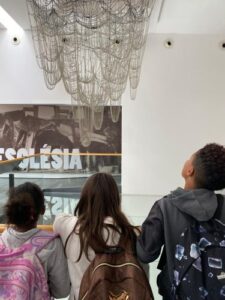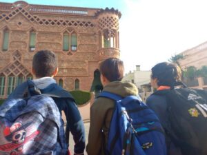 Després d’una petita pausa per esmorzar, han passat pel Centre d’interpretació de la Colònia Güell on han vist un audiovisual de projecció immersiva que mostra com era un dia a la colònia fa més d’un segle a través de la mirada de la Laia, una nena de 10 anys que vivia i treballava a la colònia.