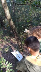 Després han entrat amb els ulls embenats al bosc per tal de potenciar tots els sentits i descobrir noves sensacions. Han gaudit força d’aquesta nova experiència i a més han aprés a esbrinar l’orientació del vessant amb la brúixola.
