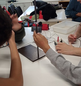 Un dels grups ha experimentat com les plaques fotovoltaiques poden convertir la llum del sol en electricitat muntant un circuit tancat per fer anar un molinet. Com que el sol no s’ha deixat veure en tot el dia, han hagut d’utilitzar unes là mpades d’estudi amb bombetes de 60w per tal d’excitar les plaques i alimentar un petit motor que fa girar els aspes d’un molinet. En canviar l’orientació de les là mpades o tapar-les parcialment, la velocitat del molinet ha disminuït fins aturar-se.