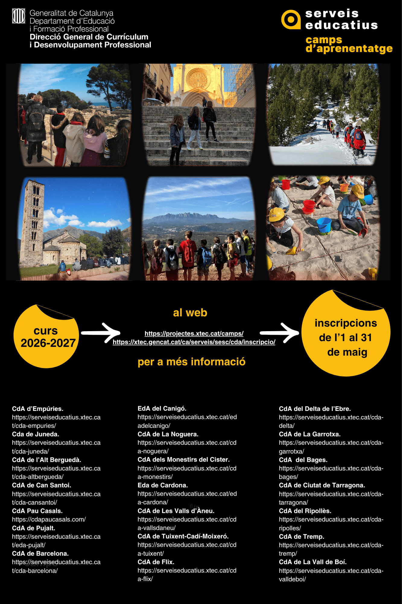 Els Camps i Entorns d’Aprenentatge compartim el cartell de la campanya d’inscripcions per a les estades i sortides del curs 2026-2027, elaborat pel Servei de Xarxes i Serveis Educatius del Departament d’Educació i Formació Professional.