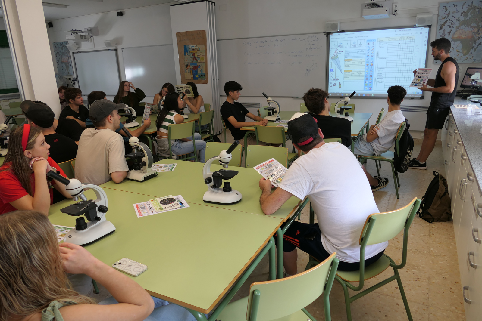 – El tercer dia va estar centrat en l’estudi de l’ecosistema marí de la badia dels Alfacs. L’alumnat de tots dos centres van fer una sortida en caiacs per descobrir el cultiu aqüícola dels musclos al delta i els reptes als que s’enfronta, també relacionat amb el canvi climàtic. Es va aprofitar la sortida per a fer mesures i agafar mostres d’aigua per veure quins eren els productors d’aquest ecosistema, si les fanerògames marines (mesures de fondària, transparència i Tª) o per contra, els organismes fotosintètics presents a l’aigua: el fitoplàncton (presa de mostres amb una malla de niló de 100 micres). Aquesta mostra va ser estudiada al laboratori amb microscopis, on l’alumnat va identificar i classificar diferents organismes tant del fitoplàncton com del zooplàncton. Finalment es va establir quina era la xarxa tròfica a l’ecosistema marí de la badia, destacant la interacció i influència de l’aportació d’aigua dolça i nutrients del riu Ebre en la productivitat biològica de la badia.