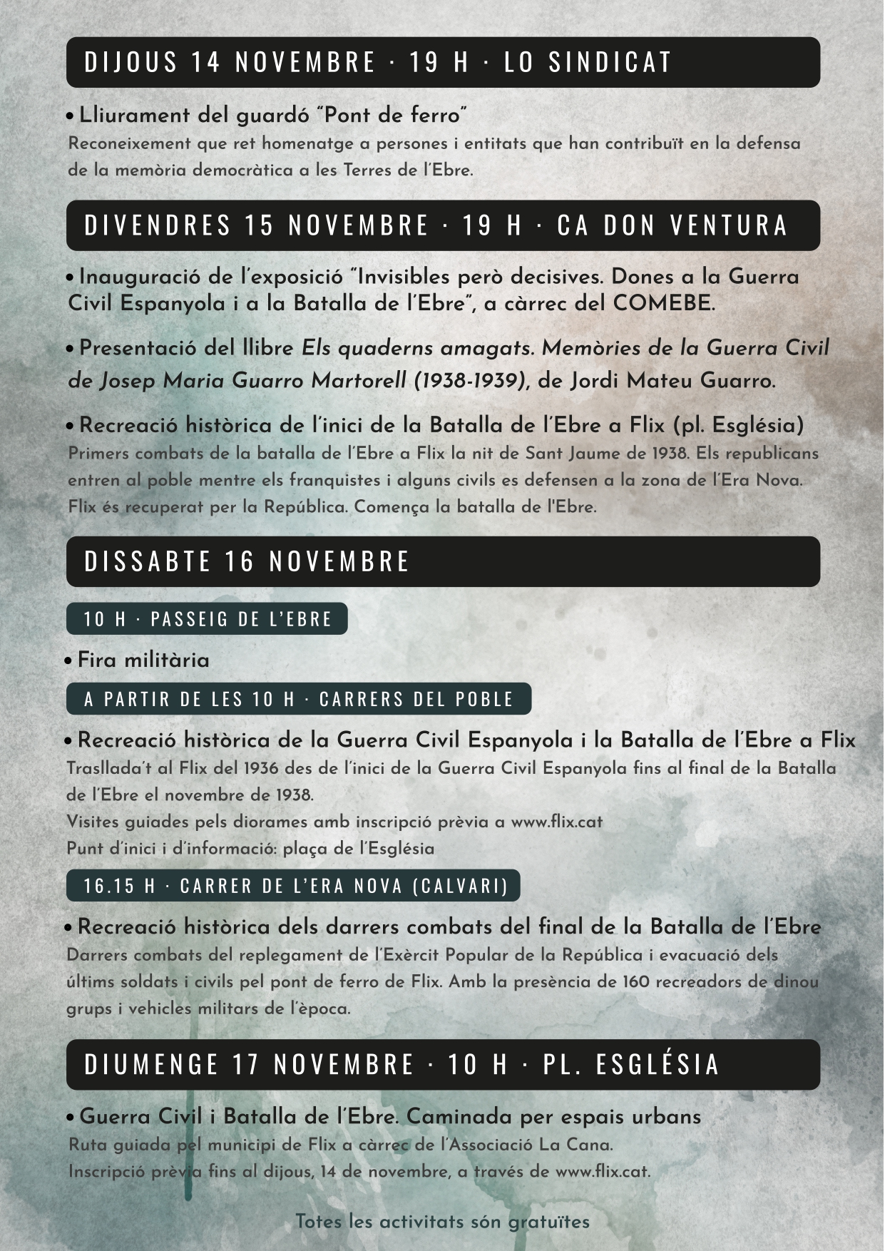 Presentacions de llibres relacionats, visites guiades als diorames de la Recreació històrica del matí de dissabte, i “Guerra Civil i Batalla de l’Ebre. Caminada per espais urbans” el diumenge. Us ho perdreu?