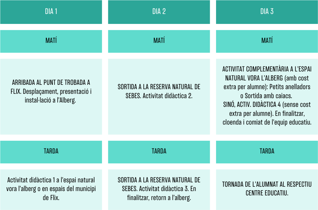 • Activitats complementàries (amb preu extra per alumne): generalment la majoria de centres educatius, demanen que la seqüència didàctica de l’estada finalitzi l’últim dia amb una activitat complementària molt significativa que gràcies al seu caràcter pedagògic, que s’inclou dins horari lectiu al matí: Petits anelladors (anellament científic d’ocells) o Sortida amb caiacs pel meandre de Flix. Tanmateix si un centre no vol seguir aquest format, s’ofereix una proposta d’activitat didàctica que no tingui cost addicional per l’alumnat.